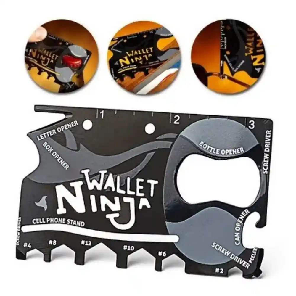Tarjeta multiherramienta Wallet Ninja. Diseñada con el tamaño de una tarjeta de crédito, la Wallet Ninja cabe fácilmente en tu billetera o portafolio. Fabricada en acero, es resistente, duradera y ligera, ideal para quienes buscan funcionalidad sin ocupar espacio. - 18 herramientas en 1: destornillador, abrelatas, abrebotellas, soporte para celular, llave hexagonal, extractor de clavos ¡y más! - Ideal para emergencias, camping, ciclismo, bricolaje, y más. -Herramienta de supervivencia táctica: una multiherramienta imprescindible, perfecta para paquetes de emergencia, preparación para desastres y kits de supervivencia