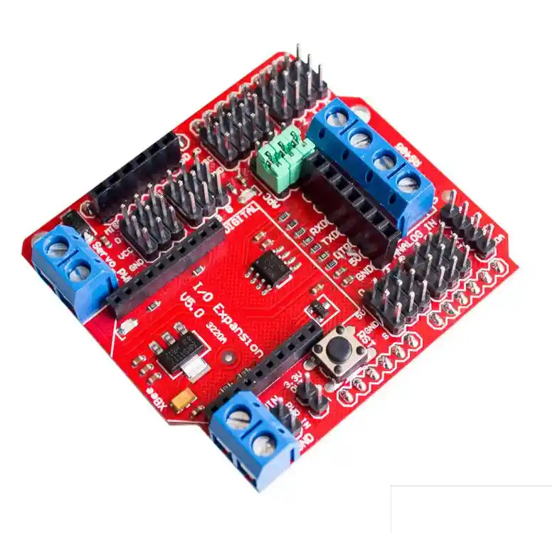 14 puertos IO digitales extendidos (12 Servo Interface) y alimentacion; 6 puertos IO analogicos y alimentacion; Un terminal de alimentacion externa del puerto digital; La fuente de alimentacion externa del puerto digital y el tablero de poder automatico; Un terminal de entrada de alimentacion externa y un pin de entrada; Interfaz RS485; Boton de reinicio; Interfaz inalambrica de transmision de datos XBee / Bluetooh Bee Bluetooth; Interfaz de transmision de datos inalambrica Bluetooth APC220 / Bluetooh V3; La interfaz IIC / I2C / TWI; Puerto de salida de 3.3V; Interfaz de modulo de tarjeta SD; LA COMPRA INCLUYE: 1X TARJETA DE EXPANSIoN XBEE V5