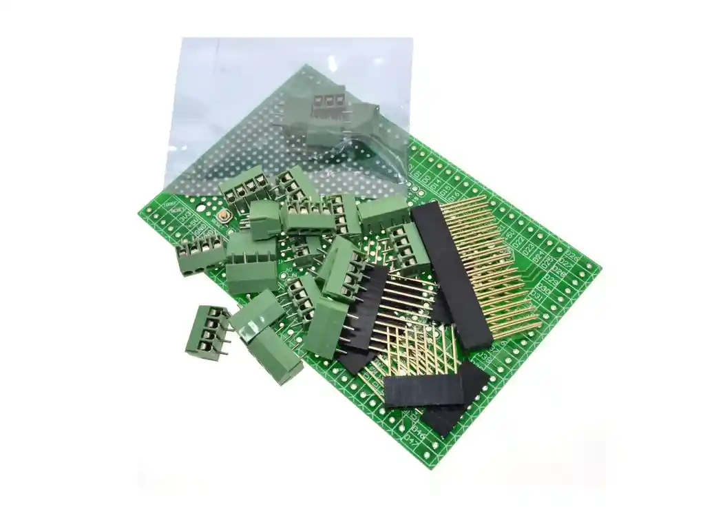 Kit de placa protectora de bloque de terminales / tornillo prototipo para ArduinoMEGA-2560 R3. El kit incluye PCB prototipo, bloques de terminales, enchufes de cabezal hembra. Variedad de métodos de montaje sin ensamblar, puede hacer un uso flexible. TARJETA DE CIRCUITO IMPRESO: PCB de fibra de vidrio FR-4, doble capa de cobre, tamaño 120 mm x 78 mm. Rejilla / paso de almohadillas 2,54 mm / 0,1 ", diámetro del orificio 0,8 mm. Paso del bloque de terminales 3,5 mm / 0,138 ", diámetro del orificio 1,2 mm. Bloque de terminales: Paso de 3,5 mm / 0,138 "mini bloques de terminales, total de 84 pines (3 polos x24 piezas, 2 polos x6 piezas). Rango de cable 26 ~ 16AWG, longitud de tira de 5 mm, tornillos de acero M2, cabezal de clavija de latón. Enchufe de encabezado hembra: Paso 0.1 "/2.54 mm, longitud del pasador 15 mm / 0.59" Fila única de 10 pines x1 piezas, fila individual de 8 pines x 5 piezas, fila doble de 18 pines x1 piezas. LA COMPRA INCLUYE: 1x SHIELD TERMINALES BORNERAS ARDUINO MEGA