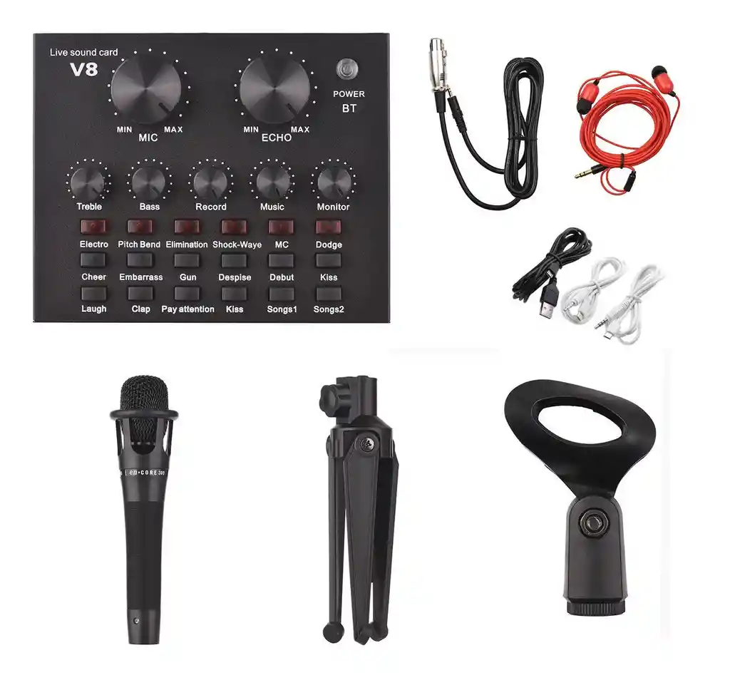 12 tipos de efectos de sonido, 12 tipos de audio, conexión de transmisión en vivo de dos teléfonos, conexión de acompañamiento móvil en vivo/computadora, conexión de acompañamiento/En Vivo de computadora, conexión de grabación de canciones K. AP8048A chip de sonido: estructura de doble núcleo, la frecuencia de trabajo más alta puede alcanzar los 368,64 MHZ. Tiene 64KM de SRAM de datos y 48 conjuntos de instrucciones DSP eficientes. Es adecuado para todo tipo de procesamiento de algoritmo de audio complejo. CARACTERÍSTICAS: Sistema de tracto Vocal: doble canal Frecuencia de muestreo de salida: 32KHz Muestreo de dígitos: 16bit Modo multialtavoz: 2,0 Interfaz de Audio: Interfaz de 3,5mm Capacidad de la batería: 1200mAh Carga: 5V/1a Compatible: WIN XP/7/8/10, para MAC y otros sistemas. Tamaño de la tarjeta de sonido: 125*105*35mm/4,92*4,13*1,37'' EL PAQUETE INCLUYE: 1 x tarjeta de sonido 1 x micrófono 1 x auriculares 1 x capacitancia Cable 2 x acompañamiento Cables 1 x Cable de carga 1 x micrófono titular 1 x caja de aluminio 1 x Manual del usuario
