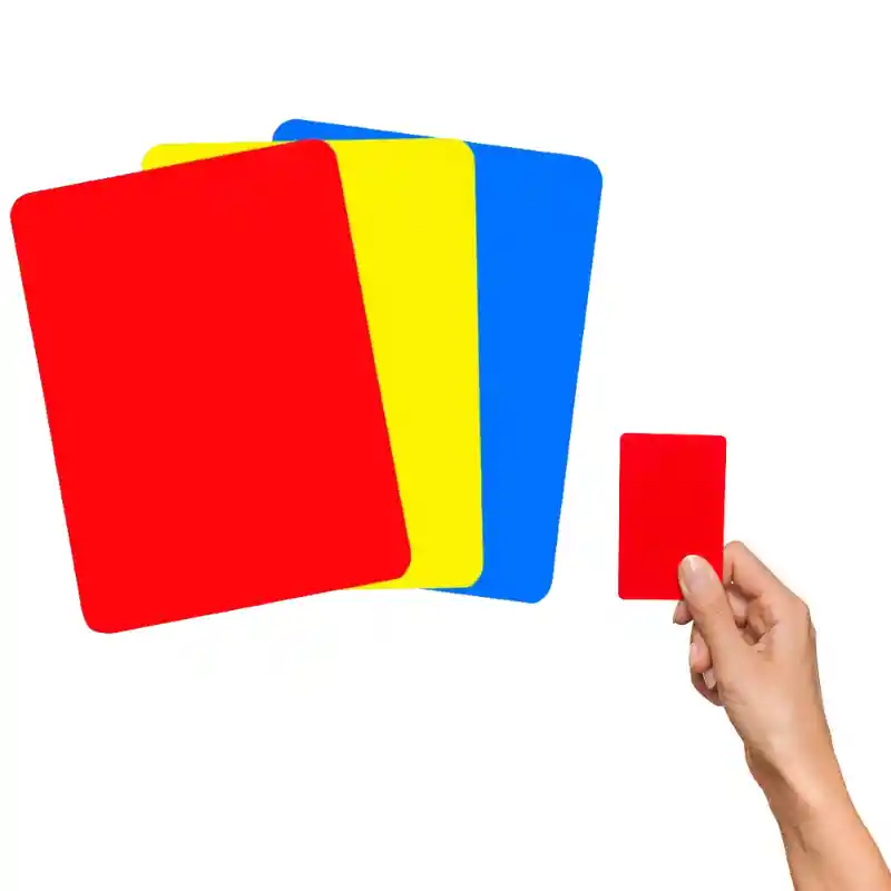 Tarjetas de Arbitro Juez Libretas Arbitraje Futbol Amarilla Azul Roja Tarjeta árbitro de cantos romos y tamaño perfecto para que la puedas llevar en el bolsillo con total comodidad. - Tarjeta árbitro de material flexible en diferentes colores. - Material: PVC laminado. - Tamaño compacto 10 x 8 cm. - Cantos romos - Flexible - Fabricada en PVC laminado de larga duración con los cantos romos para evitar que se enganche al introducirla o sacarla del bolsillo. - Cantos romos. El Paquete Incluye: - 3 Tarjetas de Arbitraje Amarilla, Azul y Roja.