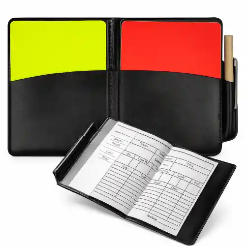 Contenido del Kit: 1 Estuche o cartera porta tarjetas. 1 Tarjeta Roja. 1 Tarjeta Amarilla (algunos kits incluyen azul). Libreta o juego de hojas para anotaciones (reporte de juego). 1 Lápiz pequeño. Materiales: Estuche: Cuero sintético (PU) suave y duradero. Tarjetas: PVC de alta calidad, resistente y flexible. Dimensiones Aproximadas: Tarjetas: 11 cm x 8 cm o 11 cm x 7 cm. Estuche (Cerrado): 12 cm x 9 cm aproximadamente. Estuche (Abierto): 12 cm x 18.5 cm o 12 cm x 19.3 cm
