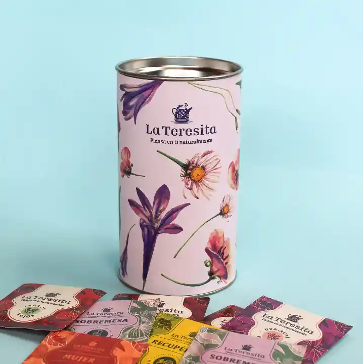 Nuestro nuevo diseño, tarro con un diseño floral de 30 infusiones surtidas especiales de La Teresita. Es el regalo perfecto o el complemento ideal para tu cocina.