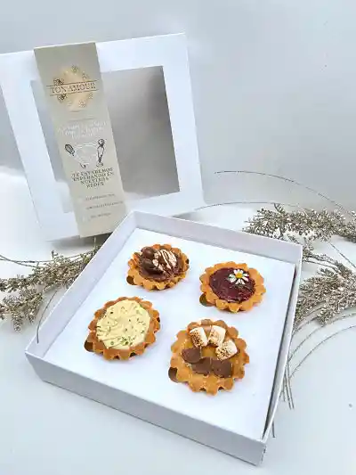 4 tartas con rellenos de: ganache de chocolate, glaseado de limon, curd de frutos rojos y caramelo salado.
