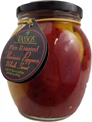 Cuidadosamente en el pico de frescura, Tassos pimiento tostado rojo y amarillo. Está libre de conservantes o aditivos.