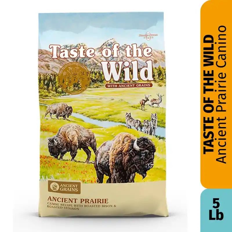 TASTE OF THE WILD ANCIENT PRAIRIE, alimento con una combinación única de bisonte criado en pastos, venado criado en pastos y granos antiguos significa que esta receta es sabrosa y rica en proteínas. También cuenta con antioxidantes para el apoyo inmunológico y más