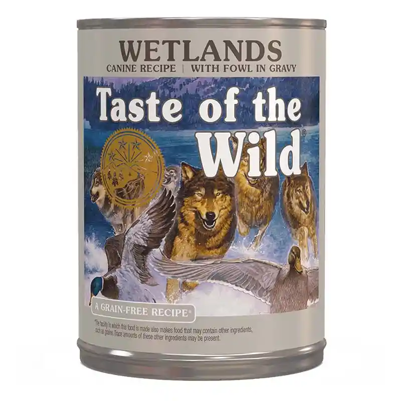 Taste of the Wild wetlands humeda 390 grs. librea de granos. Con pato en salsa. para adultos y cachorros de todas las razas.