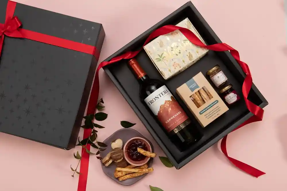 Botella de vino tinto (750 ml) acompañada de grissinis con queso parmesano (90g aprox), 2 confituras de vino (tinto y rosado. 30 ml cada una) y 9 mini alfajores.