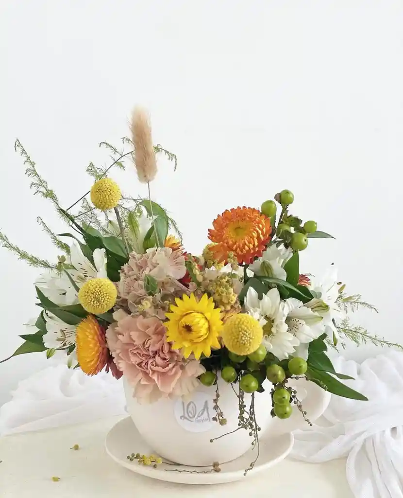 Taza pequeña en cerámica con flores del día. ideal para centro de mesa.
