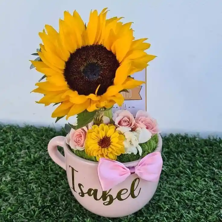Incluye: taza personalizada (esta varia segun disponibilidad), girasol x1, mini rosa x3. de color Amarillo ideal para el Agradecimiento