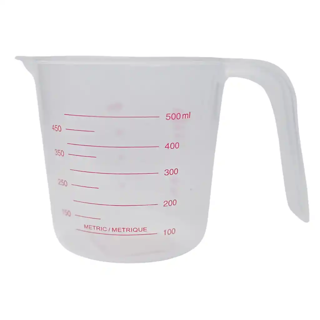 Capacidad de 500 ml para medir líquidos o ingredientes secos. Fabricada en plástico resistente, ligera y duradera. Escala medidora visible en mililitros y onzas. Ideal para recetas de cocina y repostería. Asa ergonómica para un agarre cómodo y seguro. Boquilla vertedora que facilita el vaciado sin derrames. Fácil de limpiar y reutilizar. Apta para uso doméstico o profesional. Compatible con ingredientes fríos o a temperatura ambiente. Diseño transparente para una mejor visualización del contenido. No retiene olores ni sabores. Producto ha sido ambientado; accesorios no incluidos. El color puede variar según la luz o pantalla. Práctica herramienta para cocinar con precisión.