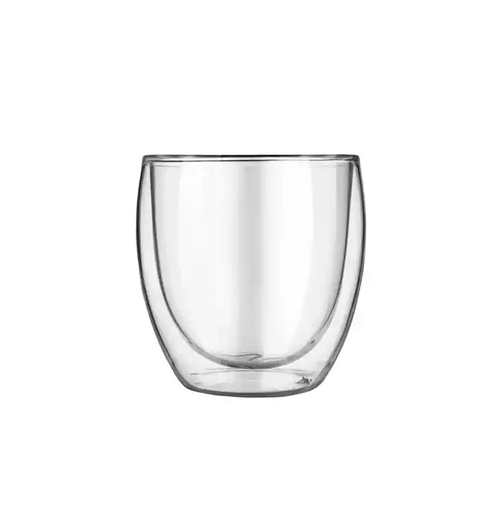 Taza o vaso de doble pared en vidrio de borosilicato (material de alta calidad compuesto por sílice y trióxido de boro, reconocido por su excepcional resistencia al choque térmico, altas temperaturas (hasta 220°C) y agentes químicos). Es ligero, transparente, no poroso (higiénico) y duradero. Ideal para bebidas a base de café como filtrados, latte, capuccino, etc. dado que mantiene caliente la bebida mientras que la temperatura exterior es ideal para el contacto con la mano. Adicionalmente decora de forma única los espacios y genera un alto impacto visual porque se aprecian todos los ingredientes de las bebidas, en capas, según la densidad de cada uno.