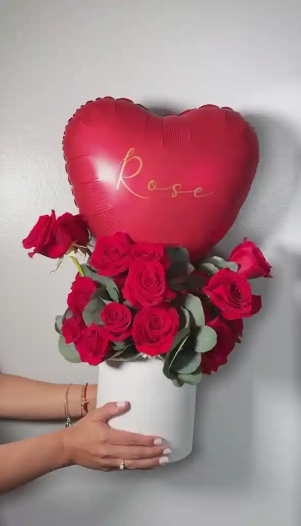 un tazón blanco con 20 tallos rojos y corazon rojo en helio
