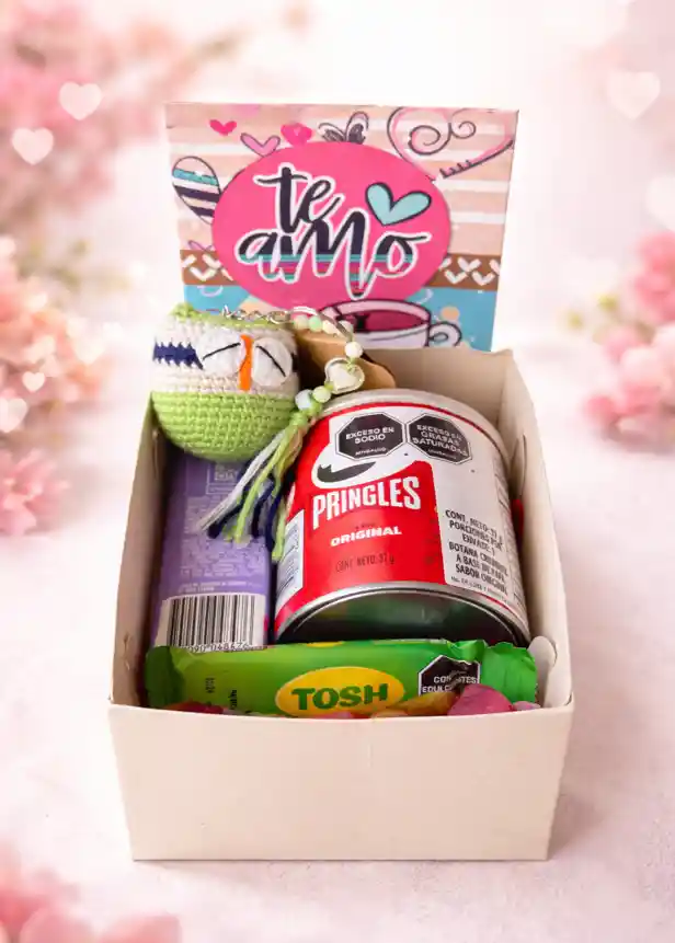 Contenido del detalle 1 llavero búho tejido a mano (colores sujetos a disponibilidad) 1 té Hatsu (200 ml) 1 Papas Pringles pequeñas 1 Tosh Cremadas (25 g) 1 caja a color con mensajes de amor
