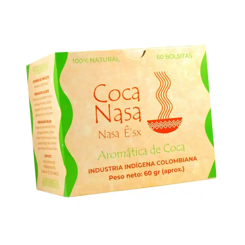 Te Coca Nasa 60 Bolsitas de Aromatica de coca Industria indígena colombiana Beneficios y propiedades de las hojas de coca: - La coca es muy rica en fibra. - Refuerza la flora intestinal. - Al ser muy rica en calcio ayuda en la prevención de la osteoporosis. - Eficaz en el tratamiento de la obesidad. - Aumenta la resistencia física. - Es digestiva y diurética. - La coca estimula la función respiratoria y combate el mal de altura. - Previene la diarrea. - Regula el metabolismo de carbohidratos. - Ayuda a combatir artritis, reumas, etc. - Ayuda en la eliminación de grasas. - Mejora el funcionamiento del hígado.