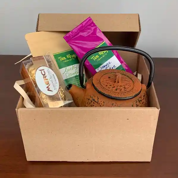 Incluye: Tetera de Hierro Para 1 Taza 1 Und + Tea Shop Bolsa de té de 50 g 2 Unidades + Chocolates 1 Und + Caja 1 Und