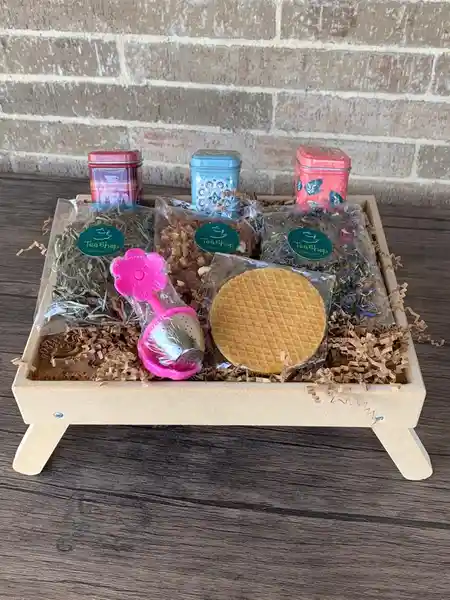 Incluye: Bandeja en Madera 1 Und + Tea Shop Bolsa de té 50 g 3 unidades + Latas Para Guardar té 3 Unidades + Infusor en Acero Inoxidable 1 Und + Galleta Holandesa 1 Und