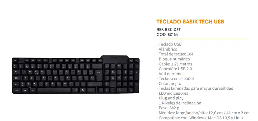 · Teclado USB · Alámbrico · Total de teclas: 104 · Bloque numérico · Cable: 1.25 Metros · Conexión: USB 2.0 · Anti derrames · Teclado en español · Color: negro · Teclas laminadas para mayor durabilidad · LED indicadores · Plug and play. · 1 Niveles de inclinación · Peso: 342 g · Medidas: largo/ancho/alto: 12,6 cm x 41 cm x 2 cm · Compatible con: Windows, Mac OS 10,5 y Linux