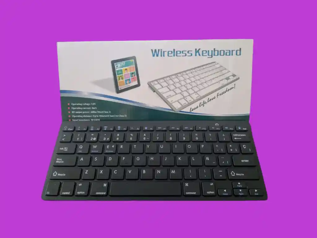 Compatible con el sistema operativo WINDOWS, como Windows 2000, NT, XP, Vista, etc. Compatible con el sistema operativo MAC OS, iPad, Phone OS 4.0. También es compatible con el sistema operativo móvil Windows. Todos estos no se necesita instalar ningún controlador, puede usar directamente con la función de Bluetooth. Teclado inalámbrico de Bluetooth 3.0, sin molestar de los cables. Alimentado por dos pilas AAA, se puede usar de forma continua durante tres meses. Ultrafino, el grueso principal de solo 6,7mm, material de keycap es láser ABS y PC, el grosor es solo 2,5 mm. El tacto de las teclas son suaves y el sonido de teclear es tranquilo, la vida útil es más de 2-3 veces más que el teclado común.