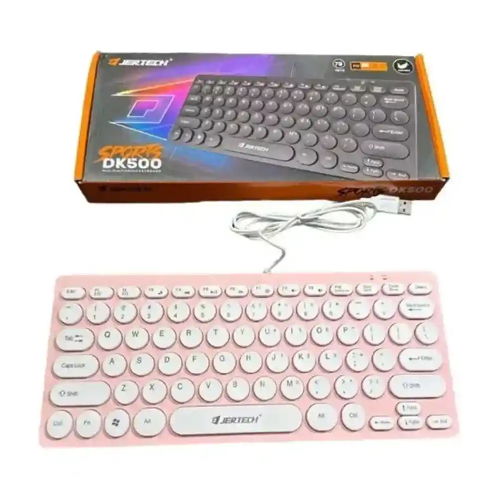 Marca y Modelo: JERTECH DK500. Conectividad: Conexión USB 2.0 alámbrica con una longitud de cable de 1.2 metros. Diseño: Diseño mini y ergonómico, pensado para reducir la fatiga durante un uso prolongado. Teclas silenciosas tipo óptico. Funciones multimedia integradas. Diseño a prueba de salpicaduras. Dimensiones y Peso: Longitud: 275 mm. Ancho: 120 mm. Altura: 10 mm. Peso aproximado: 320 gramos. Compatibilidad: Compatible con sistemas operativos Windows XP/Vista, Win 7, Win 8, MacOS, Linux y Smart TV con conexión USB. Durabilidad: Vida útil de las teclas superior a 10 millones de pulsaciones. Este teclado es adecuado tanto para el trabajo de oficina y el hogar como para videojuegos. Es un teclado con cable USB 2.0. Cuenta con 78 teclas, incluyendo funciones multimedia. Su diseño es delgado y compacto, ideal para portabilidad. Las teclas son delgadas, redondas y silenciosas. Es compatible con sistemas operativos Windows y Mac.