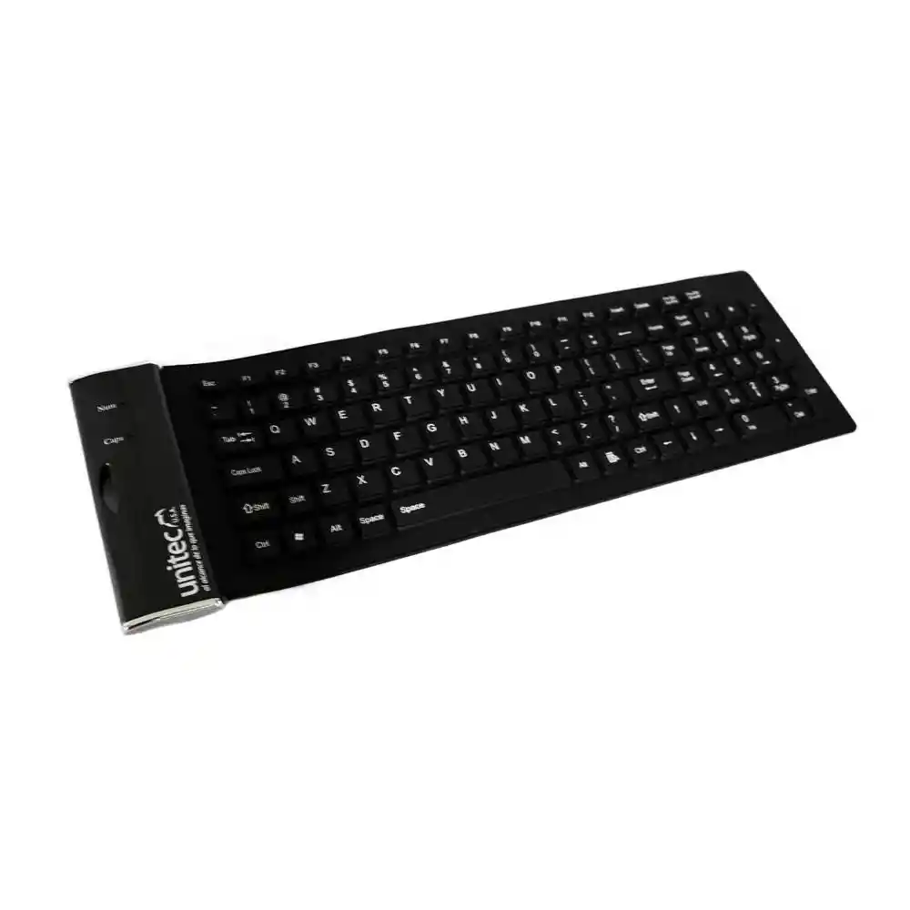 Teclado Flexible UNITEC Impermeable para PC Anti Polvo USB Diseñado en Nitro Gel de alta densidad resistente al agua, polvo y maltrato. Muy práctico, cómodo y versátil compatible con todos los sistemas operativos y computadores. Tamaño real con teclado numérico. Diseño extra flexible que le permite adaptarse a cualquier situación o lugar sin importar las condiciones ambientales, teclas recubiertas de silicona muy agradable al tacto y de buena precisión y respuesta a la presión, soportan cientos de horas de uso continuo. Caracteristicas: Material impermeable y resistente Conexión USB