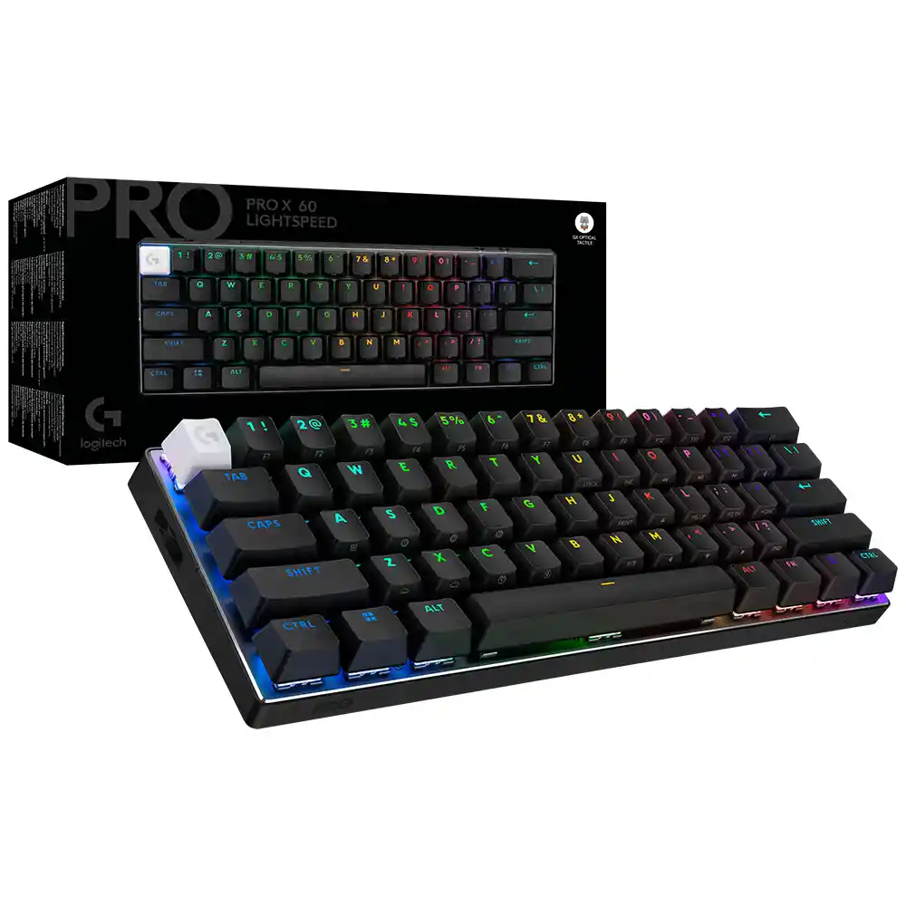 RENDIMIENTO SIN COMPROMISOS Diseñado en colaboración con los mejores jugadores de esports del mundo, PRO X 60 se ha diseñado para romper cualquier barrera entre tú y la victoria. Compite a un nuevo nivel con la próxima generación de teclados PRO. Especificaciones: Dimensiones: Altura: 290 mm Ancho: 103 mm Profundidad: 39 mm Iluminación: RGB LIGHTSYNC Formato: 60% Cable: Extraíble de 1,8 m Velocidad de respuesta: 1 ms Duración de batería (Recargable): hasta 65 horas Radio de acción inalámbrico: hasta 10 m Tipo de conexión: 2.4GHz LIGHTSPEED, Bluetooth Incluye: Teclado PRO X 60 para juegos Adaptador inalámbrico LIGHTSPEED USB Cable de carga y datos USB-A a USB-C Tecla Logitech G Funda protectora Documentación del usuario Garantía: 24 Meses