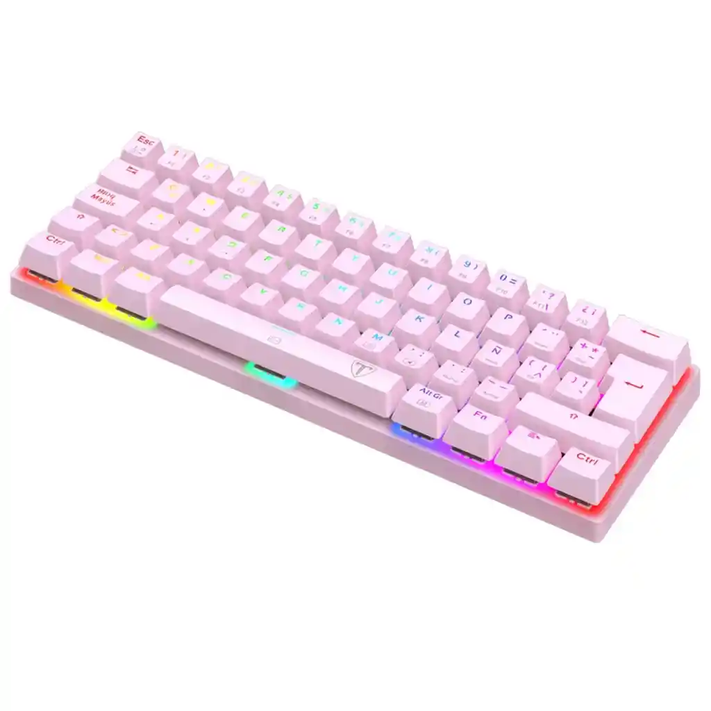 TECLADO GAMER MECÁNICO T-DAGGER T-TGK321 ARENA, ILUMINACIÓN RGB DISTRIBUCIÓN EN ESPAÑOL ARENA T-TGK321P-RGB El Arena es un teclado mecánico de tipo 60%: con sólo 61 teclas, le concede la mayor libertad posible al ratón sin ceder en funcionalidad. Es un competidor temible, con interruptores mecánicos de alto nivel y todas las funciones necesarias para el juego. Y es tan bonito que, cuando lo recibas, no podrás evitar que tu cara se vea así: UwU. INTERRUPTORES PARA DARLE AL WASD El Arena está equipado con interruptores T-Dagger Red: con una durabilidad de 50 millones de clics. Sus teclas son de doble inyección y cuenta con doble tecla FN para preservar todo el poder de un teclado completo. Además, posee full key rollover y bloqueo de tecla Windows para que esas pezuñas que llamas manos tecleen con confianza. EL TOQUE DE BRILLO DE NUESTRA DAGA Aunque ahorra espacio valioso en el escritorio, el Arena ciertamente no ahorra en luz y color. Está equipado con 18 efectos de iluminación con brillo ajustable y la posibilidad de personalización tecla por tecla. Y sabemos que tomar decisiones no es tu fuerte, pero por suerte las 2 opciones son ganadoras: el Arena blanco o el negro, ¿cuál te llevas? UN IMPONENTE LUCHADOR Será pequeño, pero es sólido. El Arena está hecho con ABS reforzado de alta calidad y está preparado para resistir los trotes del gaming. También es a prueba de polvo y salpicaduras, lo que resulta muy conveniente, ya que está pensado para ser transportado de acá para allá con total comodidad, con su cable USB desmontable y su adorable tamaño mini. ESPECIFICACIONES TÉCNICAS TIPO: Mecánico INTERRUPTORES: RED TECLAS MULTIMEDIA: No TECLAS MACRO DEDICADAS: No BLOQUEO DE TECLA WINDOWS: Si TAMAÑO DEL TECLADO: Compacto 60% REPOSAMUÑECAS: No RETROILUMINACIÓN: Si, RGB CABLE: Cable USB-C a USB-A , PVC, 1.50 mts, extraíble MATRIZ: 61 teclas Full Rollover CONSTRUCCIÓN: Plástico ABS reforzado ANTISALPICADURAS: Si DISTRIBUCIÓN: Español PESO: 390 g. DIMENSIONES: 293 x 104 x 35 mm EXTRAS: Keycaps de inyección de doble disparo, grabadas con láser SOFTWARE: Si COLOR: ROSADO CONTENIDO DE LA CAJA: Extractor de switches, Extractor de keycaps, Cable USB-C a USB-A, Manual.