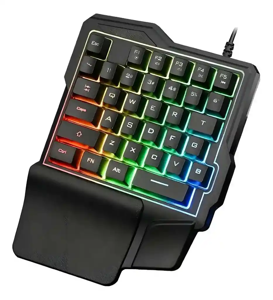 Domina tus partidas y optimiza tu espacio de juego con este teclado gamer de una sola mano, diseñado específicamente para ofrecer una experiencia ergonómica superior en juegos de acción, FPS y MOBA. Su estructura compacta de 35 teclas incluye todas las funciones esenciales para el combate, permitiendo que tu mano descanse de forma natural sobre su reposamanos integrado, lo que reduce drásticamente la fatiga y la presión en la muñeca durante sesiones prolongadas. Cuenta con una vibrante retroiluminación LED tipo arcoíris que no solo mejora la estética de tu setup, sino que facilita la visibilidad en entornos oscuros. Gracias a su tecnología Plug and Play y su cable reforzado, es la herramienta definitiva para jugadores de PC o usuarios de dispositivos móviles que buscan precisión, rapidez y comodidad absoluta en un formato portátil y resistente. FICHA TÉCNICA Modelo: K7 Cantidad de teclas: 35 teclas (Distribución esencial para juegos) Iluminación: LED RGB Rainbow (Efecto arcoíris) Conectividad: Cable USB alámbrico (Plug and Play) Ergonomía: Reposamanos integrado de gran tamaño Vida útil de teclas: 10 a 20 millones de pulsaciones Voltaje de operación: 5V Corriente de trabajo: Menor a 200mA Material: Plástico ABS de alta resistencia y durabilidad Compatibilidad: Windows 7/8/10/11, macOS, Linux, Android e iOS (requiere adaptador para móviles) Dimensiones: 22.5 cm x 17.5 cm x 3.5 cm aproximadamente Peso: 360g POLÍTICAS DE GARANTÍA El producto cuenta con una garantía de 30 días calendario a partir de la fecha de recepción. Esta garantía cubre exclusivamente defectos de fábrica en el sistema electrónico de las teclas o fallas en la iluminación LED. No se aceptarán garantías por daños físicos derivados de un uso inadecuado, tales como derrame de líquidos, golpes, cables trozados o desgastados por tirones, ni por evidencia de que el dispositivo haya sido abierto. Para hacer efectiva la reclamación, es indispensable presentar el producto con su empaque original y todos sus accesorios en perfecto estado.