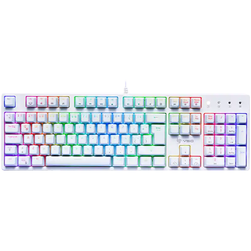 Teclado mecánico de tamaño completo con interruptores Kailh azul. Retroiluminación RGB personalizable. Este teclado VSG de alto rendimiento permite que puedas disfrutar de horas ilimitadas de juegos. Está diseñado especialmente para que puedas expresar tanto tus habilidades como tu estilo. Podrás mejorar tu experiencia de gaming, ya seas un aficionado o todo un experto, y hacer que tus jugadas alcancen otro nivel. Distinción a todo color Su retroiluminación da un toque diferente a tu equipo y resalta su composición cuando es utilizado en espacios poco iluminados. Especificaciones: Teclas: 105 Peso: 1097g Dimensiones: 140 x 440 x38 mm Tasa De Sondeo: 1000Hz Switches: Kailh Categoría Switch: Regular Color Switch: Rojo Durabilidad: 50 Millones de pulsaciones Conectividad: USB 2.0 RGB: RGB 16.8 millones de colores (20 efectos) Garantía: 12 meses
