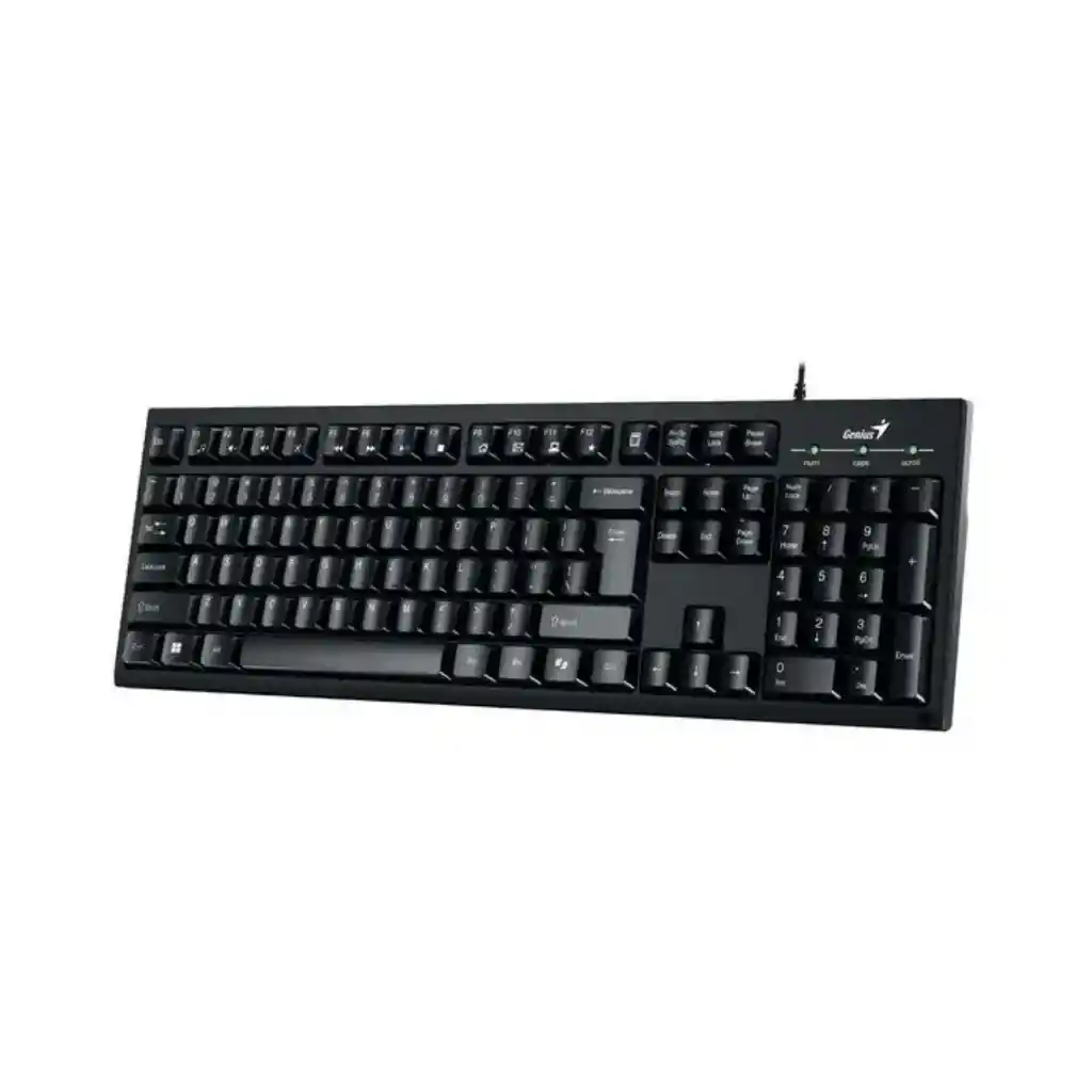 El Genius Smart KB-100 es un teclado alámbrico que combina comodidad, funciones útiles y resistencia, perfecto para oficina, estudio o uso diario. Tiene 12 teclas FN personalizables (son accesos directos muy útiles para multimedia y navegación) y una tecla especial AI Copilot, que activa el asistente Copilot en Windows 11. Su diseño resistente a derrames lo protege de accidentes con líquidos. Las teclas son tipo membrana, cóncavas al tacto para mayor comodidad, y cuenta con cable USB de 1.5 m para que puedas ubicarlo con libertad. Tiene pad numérico completo, pesa alrededor de 450 g y sus dimensiones son aproximadamente 440.5 × 139.7 × 20.1 mm. Compatible con Windows 7 en adelante y macOS 10.8+; listo para usar sin instalación complicada (Plug & Play).