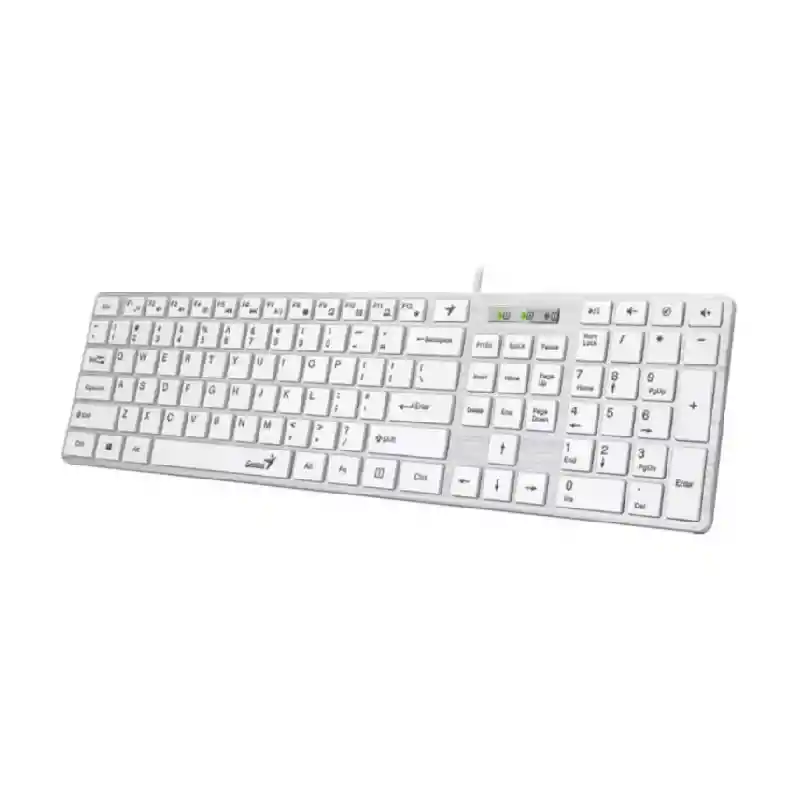 diseño ultra delgado y elegante para brindar una experiencia de escritura silenciosa y tranquila. SMART PERSONAL Genius APP con interfaz gráfica para configurar el teclado. SMART GENIUS APP PARA PERSONALIZAR TECLAS “FN” APP Genius es el único que permite personalizar las teclas “FN”. Con solo un toque al Genius Smart Key, el usuario puede ver enseguida la función de las teclas configuradas. 12 TECLAS DE FUNCIÓN MULTIMEDIA 4 TECLAS DE ACCESO RÁPIDO Las teclas de función multimedia y las de atajo permiten acceder a las músicas y navegar con rapidez . ELEGANTE SUPERFICIE PREMIUM Calidad superior con un diseño elegante y moderno. El acabado de efecto metal cepillado evita los arañazos. PLUG- AND- PLAY CONEXIÓN USB La conexión USB , plug-and-play fácil.