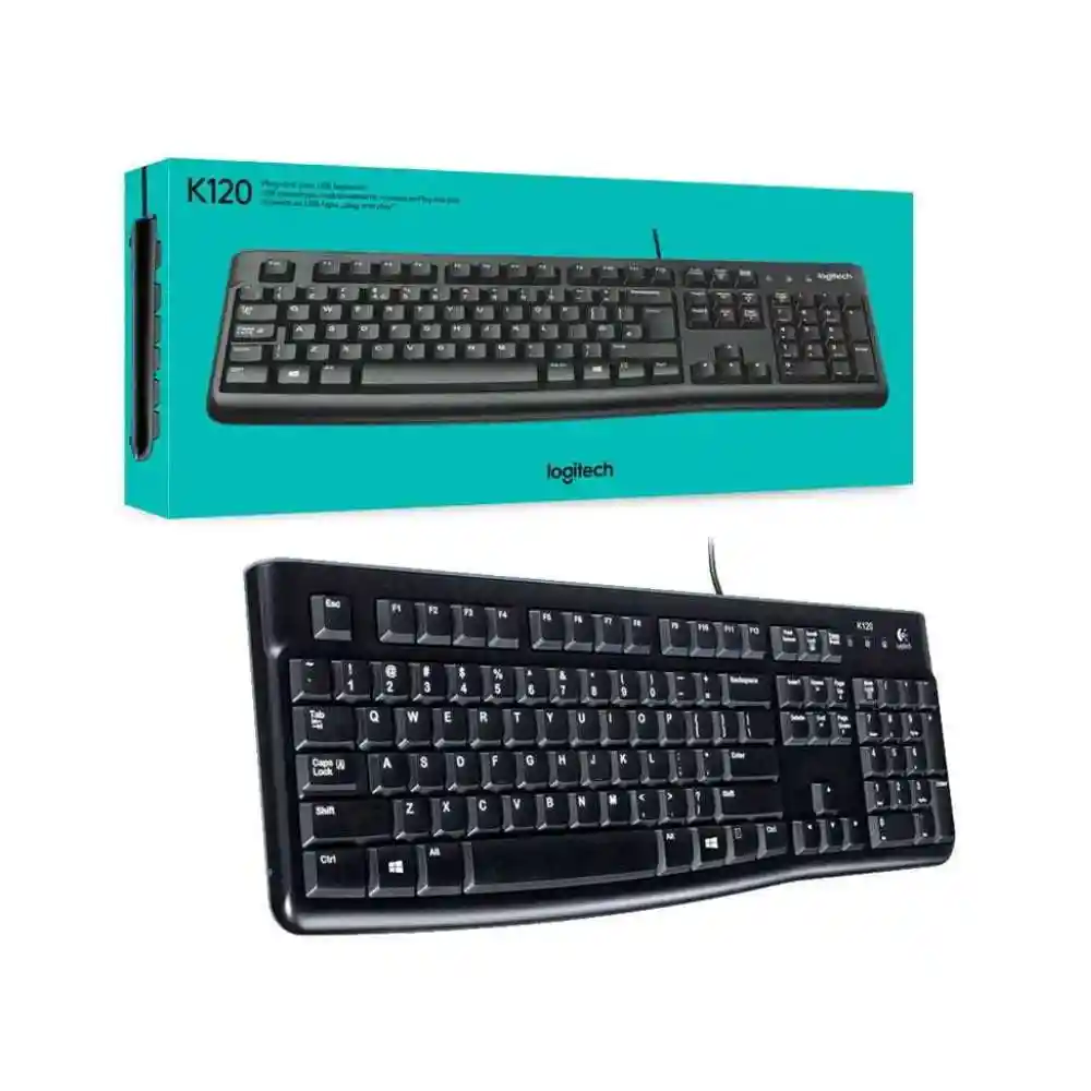 Teclado alámbrico Logitech K120 con diseño clásico y teclas silenciosas. Conexión USB plug and play, perfecto para oficinas y usuarios que buscan comodidad y durabilidad.