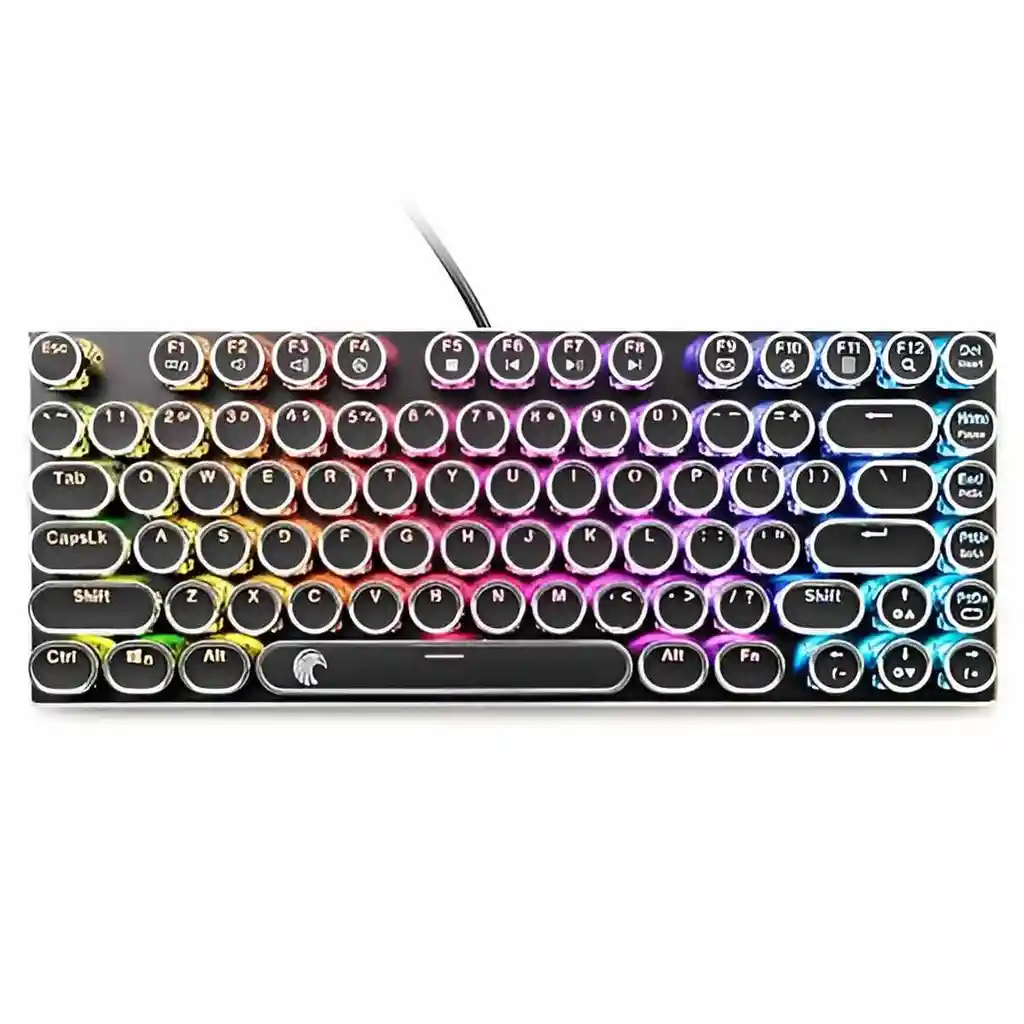 Teclado Mecánico Retro Vintage 60% Gamer Led Rgb K400 Pro Lleva tu set-up a otra época sin perder la potencia actual con este exclusivo teclado mecánico de diseño Retro-Vintage. Inspirado en las clásicas máquinas de escribir, cuenta con teclas circulares suspendidas que ofrecen una experiencia táctil única y un sonido satisfactorio en cada pulsación. Su formato compacto del 60% (68 teclas) es ideal para optimizar espacio en tu escritorio, permitiendo movimientos más amplios con el mouse, mientras que su retroiluminación LED Rainbow con efectos dinámicos resalta su elegante acabado cromado. Construido para durar, con switches de alta resistencia probados para 50 millones de ciclos, este teclado es la mezcla perfecta entre arte, nostalgia y rendimiento tecnológico para gamers y profesionales que buscan destacar. Ficha Técnica Producto: Teclado Mecánico Gamer Retro Modelo: K400 Formato: 60% Compacto Cantidad de teclas: 68 teclas Tipo de tecla: Circular estilo vintage (Máquina de escribir) Iluminación: LED Rainbow (Efectos de color mezclados) Ajustes de luz: 5 niveles de brillo y 5 niveles de velocidad Vida útil de las teclas: 50 millones de pulsaciones Interfaz: USB Alámbrico (Plug and Play) Voltaje: 5V Corriente: 120mA Dimensiones: 31.0 cm x 10.0 cm x 3.5 cm Peso: 410 gramos Funciones especiales: Bloqueo de tecla Windows, intercambio de W/A/S/D con flechas, funciones multimedia vía FN Compatibilidad: Windows, Mac OS, Linux y Consolas Políticas de Garantía El producto cuenta con una garantía de 30 días calendario por defectos de fabricación (fallas en el sensor de las teclas, fallos en el sistema de iluminación o errores de conexión USB). La garantía no cubre daños por derrame de líquidos, golpes, cables cortados o si el producto presenta signos de haber sido abierto. Para tramitar cualquier garantía, es indispensable devolver el producto en su empaque original y en perfecto estado de limpieza.