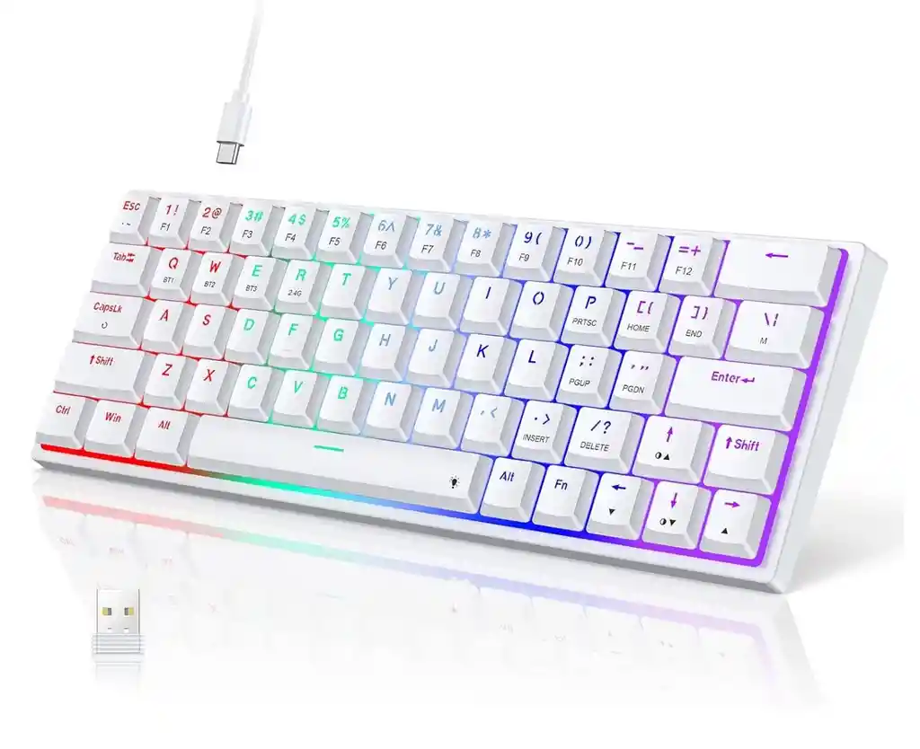 Teclado mecánico ilámbrico mejorado con 3 modos de conexión, interruptor azul sensible, perfil bajo ultra delgado, diseñopacto de 63 teclas, batería recargable. Función mejorada, precio aumentado. 40% cortado ultrafino. El grosor es de 2,2 cm, que es solo el 60% del teclado ordirio. Teclado mecánico inalámbrico con una dincia de desplaziento total más corta que activa una entrada y retroalimentación más rápido que los interruptores mecánicos convencionales/de perfil normal. Diseñopacto clásico de 63 teclas. E teclado mecánico inalámbrico adopta un diseño compacto de 63 teclas, elimina el teclado numérico y la fila de teclas F, y conserva las teclas de flecha proporcionar más espacio en el computadora. El taño es de solo 31 x 13.5 x 3, y el peso es de 467 g, puedes ponerlo fácilmente en una bolsa y llevarlo fuera. Diseñado jugadores FPS. Coloca el teclado correctamente directamente en tu computadora y no más forma torcida para ahorrar espacio en el mouse, tu mouse nunca golpeará el teclado. Disfruta agitando el mouse sin dudas y ve a obtener la victoria. Prepárate para teclados de triple modo equipado con innovadora tecnología de conexión de tres modos, cable USB-C, modos inalámbricos BT 5.0 y 2.4 GHz, cambia entre tu laptop, PC, tablet y teléfono sin problemas para duplicar la eficiencia de la oficina. Batería recargable de alta capacidad. Este teclado mecánico inalámbrico 60% tiene 360 horas de tiempo de espera y se puede utilizar continuamente durante 10 horas con luces encendidas.