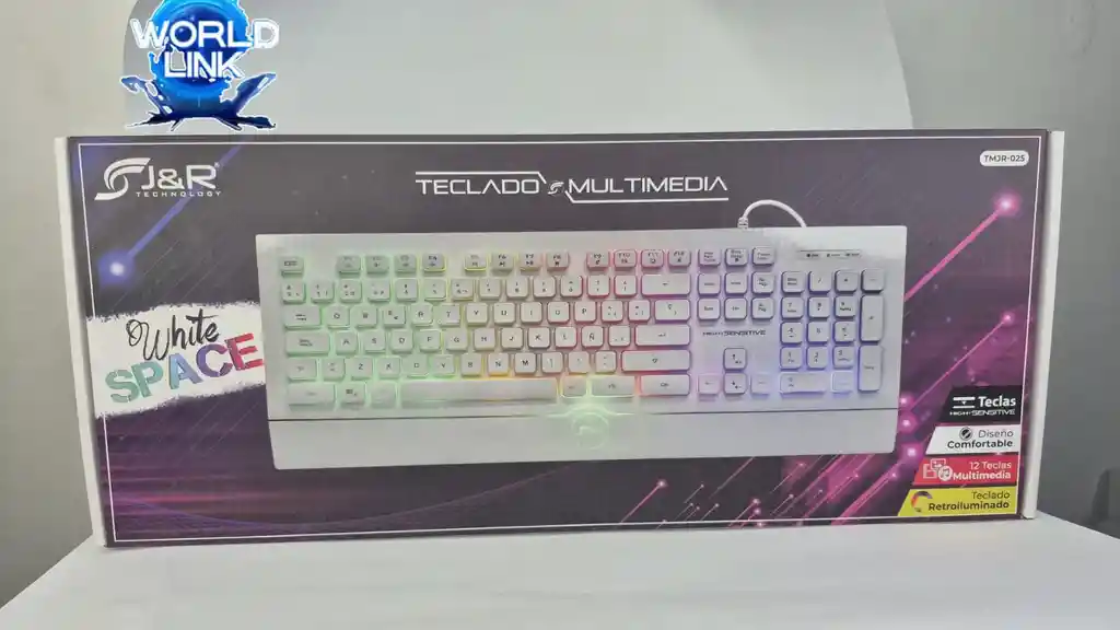 Teclado edición especial White Space, diseño ergonómico muy elegante, delgado, liviano y cómodo de utilizar, iluminación LED, teclas con tecnología High Sensitive para una sensación agradable de tecleo, 12 teclas multimedia, color blanco perla, cable 1.5m.
