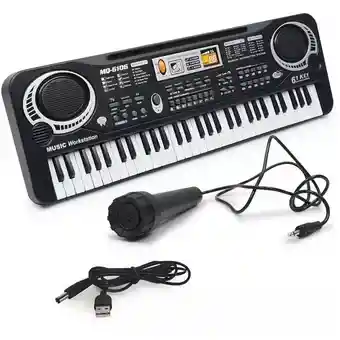 un maravilloso juguete de inteligencia musical para desarrollar la conciencia cerebral de los niñoscon excelente función de 16 tipos de timbre, 8 tipos de grabación de instrumentos de percusión, 10 tipos de ritmo, 6 demos también con el ajuste de latidos y volumenfuente de alimentación y fuente de batería, conveniente para jugar en interiores o exteriorescon un mini micrófono, los niños pueden cantar mientras jueganchino e inglés instrucción, fácil de entender, fácil de aprender, delicado 61 teclas en blanco y negromaterial: plásticocolor: negro + blancoadecuado para la edad: 2-6 añosfuente de alimentación: 6*5aa 1.5v baterías (las baterías no están incluidas) o directamente en la fuente de alimentaciónenchufe: cargador euentrada: 100v~50hzsalida: 6v~500matipo de enchufe: enchufe plano de Colombia tamaño: 54.5x17.5x5.5cm contenido del paquete: 1 x piano eléctrico1 x cargador1 x micrófonosolo el contenido del paquete anterior, otros productos no están incluidos.nota: el disparo de luz y diferentes pantallas pueden causar el color del elemento en la imagen un poco diferente de la cosa real. el error permitido de medición es +/- 1-3cm.