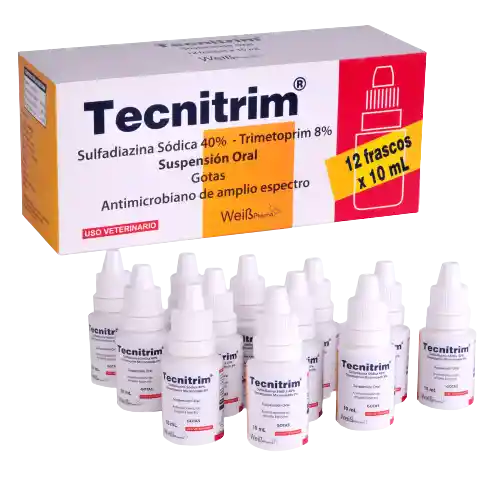 DESCRIPCIÓN: Tecnitrim oral, es un antibacteriano de amplio espectro a base de Sulfadiazina sódica y Trimetoprim micronizado, indicado para el tratamiento y control de enfermedades causadas por bacterias gram positivas y gram negativas. La asociación Sulfa-Trimetoprim produce un efecto sinérgico particularmente potente que conduce a una acción bactericida de amplio espectro. INDICACIONES: Tecnitrim oral suspensión, se recomienda en el tratamiento de diversas enfermedades, en las diferentes especies: Aves: Haemophilus sp: Coriza infecciosa, Pasteurella sp: Cólera aviar, Cólera pavos, Escherichia coli: Coliseptisemias, Colibacilosis, Staphylococcus sp: Artritis, infecciones del saco vitelino, Streptococcus sp: Septicemia. Porcinos: Haemophilus sp: Neumonia, Escherichia coli: Colibacilosis, Colisepticemia, Pasteurella sp: Pasteurelosis, bronconeumonía, Bordetella bronchiseptica: Rinitis atrófica, Staphylococcus sp: Septicemias, abscesos, Streptococcus sp. Heridas infectadas, artritis. Terneros lactantes: Fusobacterium necrophorum: Pododermatitis necrótica, Escherichia coli: Colibacilosis, Coliseptisemias, Pasteurella sp: Pasteurelosis. Caninos: Escherichia coli. Enteritis, coliseptisemias, Pasteurella sp. Bronconeumonia, Actinobacillus sp. Actinobacilosis, Aerobacter sp. Bronquitis, neumonía, Staphylococcus sp. Abscesos, septicemia, Streptococcus sp. Septicemia, heridas infectadas VÍA DE ADMINISTRACIÓN: Oral. Directamente o en agua de bebida. DOSIS: Aves: En general la dosis media recomendada es de 25 mg por kg de peso vivo. En la práctica 1 mL por 20 kg, de peso promedio. De acuerdo a la edad de las aves, calcular el peso total y en el agua a consumir en el día diluir la cantidad de Tecnitrim oral, suspensión, suministrar en esta forma durante 3 a 5 días consecutivos. DOSIS DE ACUERDO CON LA EDAD Y EL TIPO DE EXPLOTACIÓN: Pollos: 1 día a 3 semanas 1 mL por cada 3 litros de agua, 4 – 5 semanas 1 mL por cada 2.5 litros de agua, 6 – 8 semanas 1 mL por cada 2.0 litros de agua. Pollonas y ponedoras: 1 día a 15 semanas 1 mL por cada 3 litros de agua, Más de 10 semanas 1 mL por cada 2.5 litros de agua. Porcinos y terneros lactantes: En general la dosis media recomendada es de 25 a 50 mg por kg de peso. En la práctica 1 mL por 8 a 16 kg de peso vivo. Perros: De acuerdo con el tamaño: 2.5 a 5 mL, tres veces al día durante 5 días consecutivos. TIEMPO DE RETIRO: Los animales cuya carne se destine al consumo humano, no deben sacrificarse sino hasta 5 días después de finalizar el tratamiento. Consulte al Médico Veterinario.