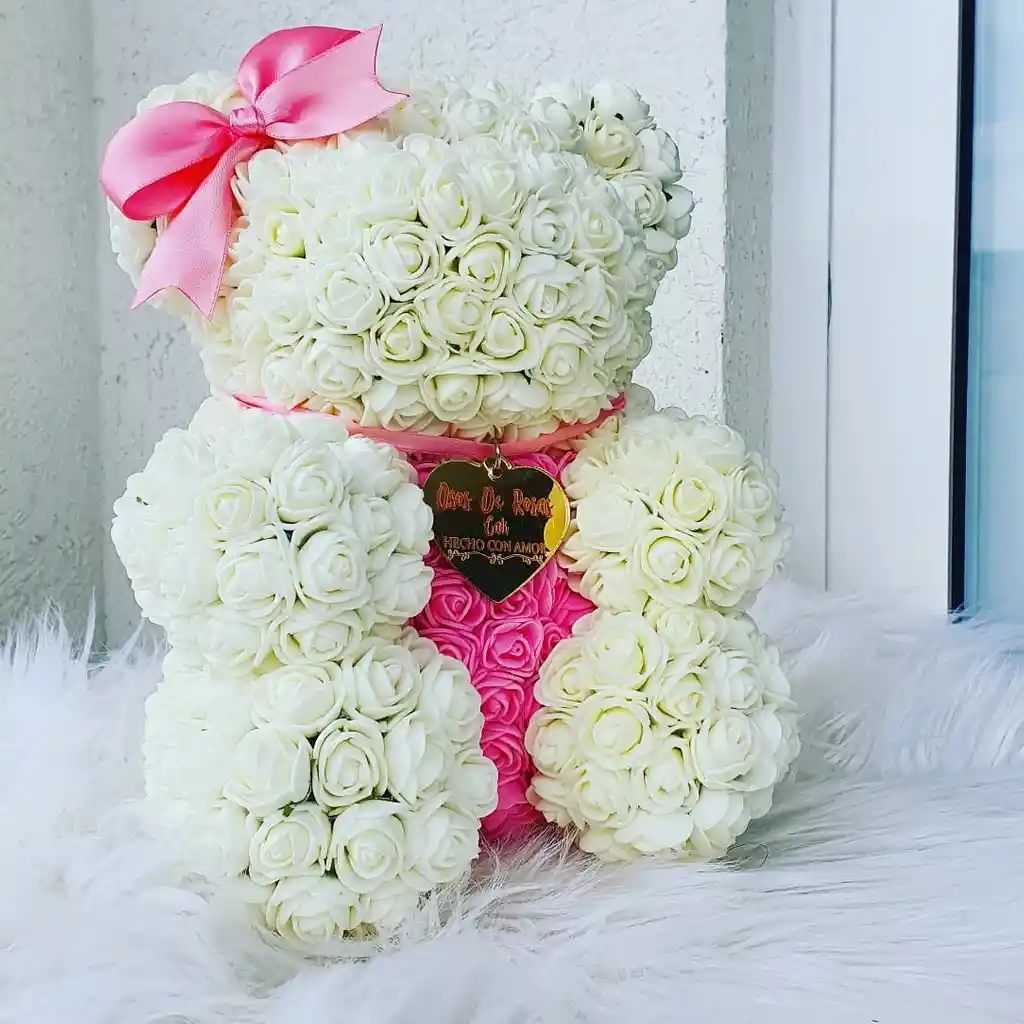 OSO PEQUEÑO 25 CM, 460 ROSAS COMPLETAMENTE HECHAS A MANO, INCLUYE CAJA TARJETA DE AGRADECIMIENTO PLACA DE AUTENTICIDAD Y TARJETA CON MENSAJE PERSONALIZADO.