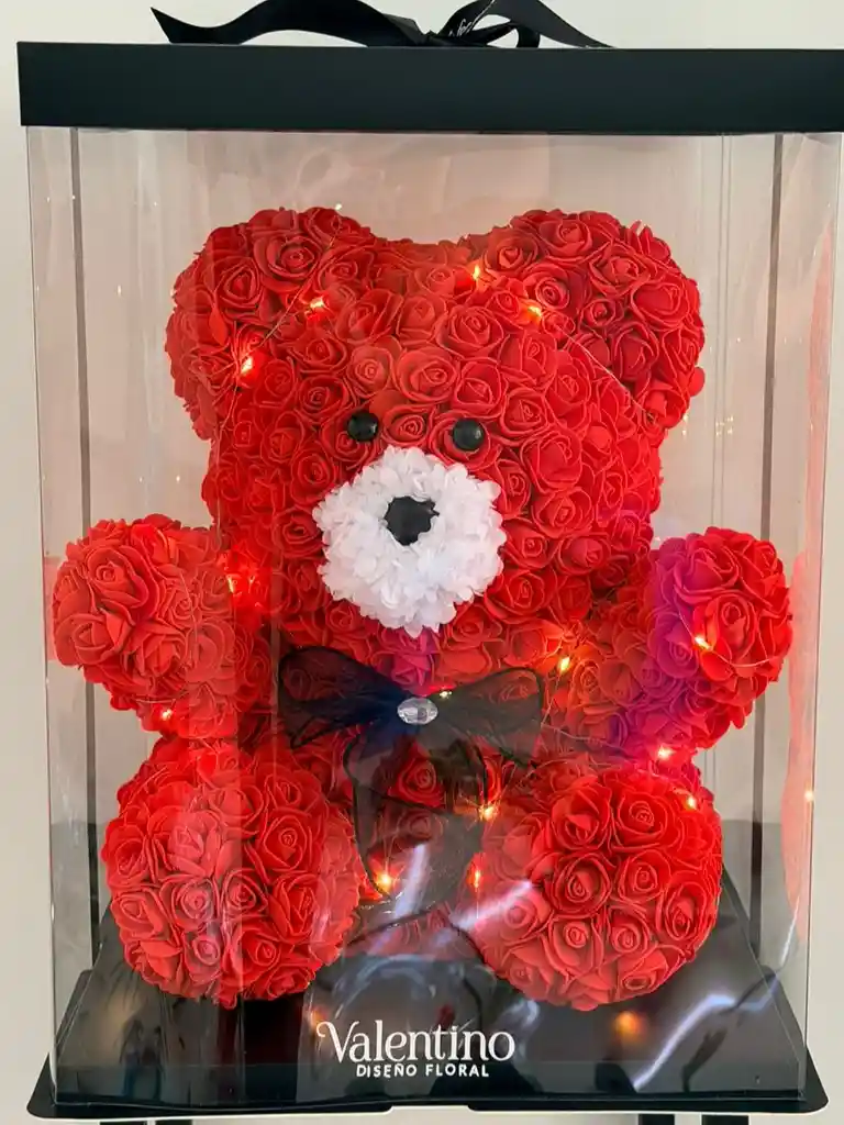 Un ícono del amor en su versión más sofisticada. Este oso elaborado con delicadas rosas rojas eternas, iluminado con sutiles luces cálidas, es una declaración que no pasa desapercibida. Presentado en caja premium transparente con acabado negro y lazo elegante, es el regalo perfecto para sorprender con intención, presencia y estilo. Porque hay detalles… y hay detalles que se convierten en recuerdo. Ideal para aniversarios, cumpleaños o simplemente para decir “eres mi prioridad”.