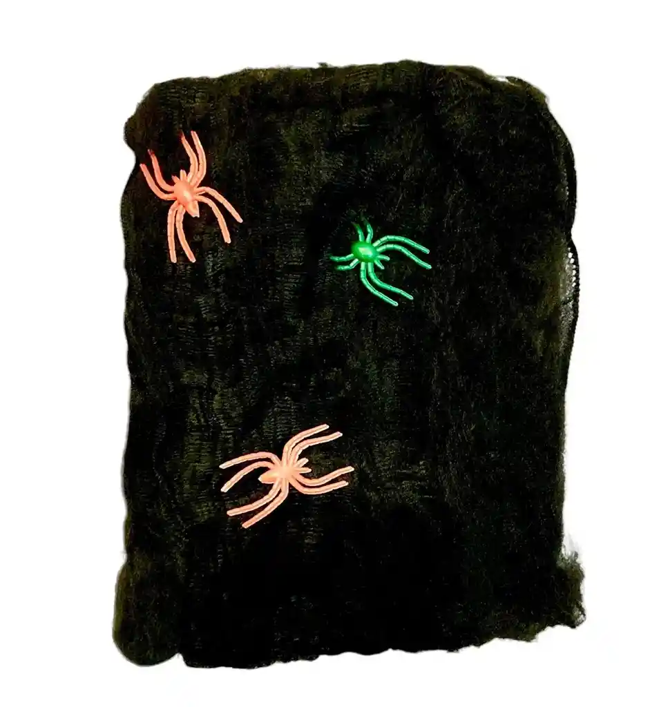 Telaraña Estirable Color Negra Mediana x 3 Arañas Halloween, Medida de cada arañita 4cm x 3 cm