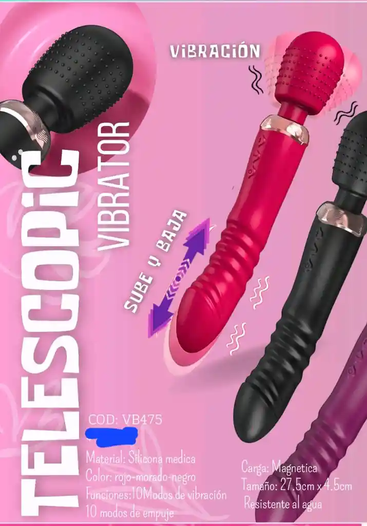 MATERIAL: Silicona Medica COLOR: Rojo - Morado - Negro FUNCIONES: 10 Modos de vibracion CARGA: Magnetica TAMAÑO: 27.5cm x 4.5cm RESISTENTE AL AGUA