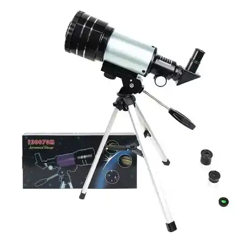 Modelo: F30070M Tipo: telescopios Material: vidrio óptico Color: plata Apertura: 70mm (2,4 pulgadas) Distancia Focal: 360mm f/4 Espejo oblicuo: 90 grados Máquina de urdimbre/trama y trípode de aluminio Lo más alto: 38cm Peso del paquete: 1.643 kg Tamaño del producto (largo x ancho x alto): 31,50x10,50x10,50 cm/12,4x4,13x4,13 pulgadas Tamaño del paquete (largo x ancho x alto): 46,50x22,00x11,50 cm/18,31x8,66x4,53 pulgadas El accesorio estándar de 0.965 pulgadas contiene: Ocular: H6mm, H20mm 3X lente Barlow 1,5x lente positiva Nota: Esta ampliación máxima: 150X (longitud focal de la lente/distancia focal del ocular x multiplicador de Barlow = aumento máximo) Sobre la configuración: -Filtro de Luna: debido a que hay una gran cantidad de luz reflejada que interfiere con nuestra observación de luna llena, podemos usar el filtro de Luna para evitar interferencias, Y entonces la superficie de la luna se verá más claramente. -Atornille el filtro lunar en la rosca de la parte inferior de los lentes del ocular y luego conecte la lente ocular con la lente zenith. Acerca de los múltiplos: -Equipado con ocular: H6mm, H20mm, los múltiplos son 300/6 = 50X, 300/20 = 15X -Si elige 3X lentes Barlow juntas, los múltiplos son 50x3 = 150X, 15x3 = 45X -Más 1.5X la lente positiva de nuevo, los múltiplos son 50x1,5 = 75X, 15x1,5 = 22,5x La fórmula: -Longitud focal de la lente del objetivo/distancia focal del ocular x multiplicador de Barlow = aumento máximo -Longitud focal de la lente del objetivo/longitud focal del ocular = aumento Secuencia de instalación: 1. Coloque el trípode y luego coloque el tubo de la lente. 2. Después de fijar el tubo, instale el finderscope (para buscar previamente el objeto objetivo), luego instale el ocular (elija uno de los dos). 3. Después de encontrar el gran objetivo, realice depuración con diferentes oculares. Nota: 1. Los múltiplos, por supuesto, no son los únicos, y depende de la combinación de factores de apertura y longitud focal. (Por ejemplo, si la ventana es grande, la luz natural es buena y la vista es clara). 2. Cuando use la lente Barlow 3X, instale la lente Barlow primero y luego instale el ocular. (Al instalar la lente Barlow, necesitamos quitar la tapa del dispositivo de instalación del ocular). 3. Solo podemos elegir un ocular para instalarlo al mismo tiempo, también lo hace la lente . El paquete incluye: 1 x telescopio astronómico 2 x ocular 1 x trípode 2 x lentes Barlow 1 x Filtro de Luna
