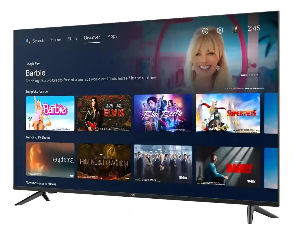 America Store te trae Televisor | JVC 55 pulgadas 4K UHD LED | LT-55KD608 Descripción Android TV ofrece miles de películas, programas y juegos de Google Play, YouTube y tus aplicaciones favoritas. La búsqueda por voz y las recomendaciones personalizadas significan dedicar más tiempo a entretenerte y menos a buscar algo bueno. Con Chromecast integrado, puede transmitir fácilmente películas, programas y fotos desde tu dispositivo Android o iOS a tu televisor. Información del producto Resolución: 3 840 x 2 160 | Tecnología Crystal Color | Chromecast integrado | Control de voz para subir, pausar o apagar el televisor | Dolby Audio | WiFi incorporado | 4 puertos HDMI / 3 USB | Modelo: LT-55KD608 | Dimensiones: 123.95 cm x 73.15 cm x 6.6 cm / 48.8" x 28.8" x 2.6" | Fabricado en China. Ficha técnica: Tamaño de la pantalla: 55 pulgadas Características de la pantalla: LED Modelo: LT-55KD608 Tasa de refresco: 60 Hz Garantía del proveedor: 1 año Smart TV: Sí Cantidad de puertos HDMI: 4 Control remoto incluido: Sí Resolución: 4K UHD Tipo: LED Procesador: MSD6886 Entradas VGA: Sin entradas Entradas RCA: Sin entradas Entradas auxiliares de 3.5 mm: No incluye Entrada Internet: Sí Conexión Bluetooth: Sí Sintonizador digital: Sí Conexión WiFi: Sí Android TV: Sí Potencia de los parlantes: 2 x 12 W Contraste: 208,3340278 Peso del producto: 10,52 kg Profundidad: 16 cm Ancho: 136 cm Alto (con/sin base): 86 cm 3D: No Lentes 3D incluidos: No Cantidad de puertos USB: 3 Tipo de pantalla: Plana Wifi direct: No Tamaño diagonal de pantalla en cm: 139,7 cm Sintonizador TDT: Otro Control por movimiento: No Control por voz: SI Aplicaciones destacadas: Netflix, Youtube, Prime Video Accesorios incluidos: Control remoto, Tarjeta de garantia, Manual de instrucciones. Hecho en: China Marca: JVC Nombre Comercial TV: Otros Sistema operativo: Android TV