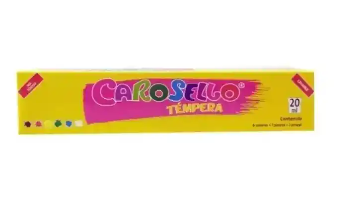 Temperas x 6 unidades Carosello colores: amarillo, azul, rojo, negro, blanco y verde. Incluye: paleta para mezclar colores y pincel, esta caja de témperas o pinturas, es clásica por sus colores e ideal para que los niños puedan aprender los colores primarios, además aprendan cómo mezclar los colores para crear toda una gama de colores. Contenido: 6 colores de 20 ml en cada frasco de témpera + 1 paleta + 1 pincel. EAN 7703064001008