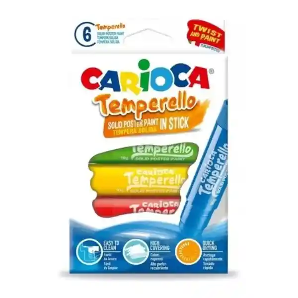 Temperas sólidas Carioca. Nuevo modo fácil, divertido e higiénico para dibujar y colorear sin usar agua ni pincel. Presentación en estuche de 6 colores brillantes con una gran cobertura y sin disolventes. Acabado satinado. Secado rápido, no arruga el papel y no necesita esmalte protector. Tinta de fácil limpieza. Material de origen italiano. -Fácil de limpiar -Alto poder cubriente -Tempera sólida en barra -No arruga el papel -Sin disolventes -Destapa y gira la tapa.