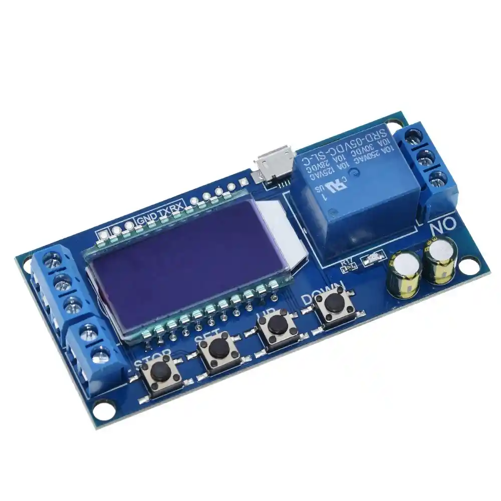 Rango de tiempo: 0.01 sec ~ 9999 min Esta pantalla LCD del producto, muy clara, simple y facil de usar, potente, pero lea atentamente las instrucciones del usuario antes de usar. 1. Pantalla con LCD de dos columnas, puede mostrar los parametros directamente; 2. Modo de disparo: nivel alto y bajo, cantidad de interruptor. Satisfaga la mayoria de las necesidades. 3. Fuente de alimentacion: 6 ~ 30V, tambien es compatible con micro USB 5.0V, muy conveniente. Conexion posterior de la fuente de alimentacion. 4. Los parametros se pueden modificar a traves de UART. 5. Boton de parada para proporcionar la funcion de parada de emergencia. 6. 5 minutos sin ninguna operacion en un estado de baja potencia. Cualquier accion despierta. 7. Los parametros OP / CL / LOP se pueden modificar individualmente 8. Todos los parametros se guardan automaticamente al apagarlos. l Introduccion al modo de trabajo (P1 ~ P7) P1: Despues de que se activa la señal, la conduccion del rele en tiempo OP se desconecta; En el tiempo OP, la señal no es valida. P2: Despues de que se activa la señal, la conduccion del rele en tiempo OP se desconecta; En el tiempo OP, la señal activa un nuevo temporizador. P3: Despues de que se activa la señal, la conduccion del rele en tiempo OP se desconecta; En el tiempo OP, el temporizador de reinicio del disparador de señal, el rele desconectado y la temporizacion de parada. P4: Cuando se dispara, despues de que el rele se desconecta del tiempo CL, el tiempo OP de conduccion del rele, una vez que se completa el tiempo, desconecte el rele. P5: Cuando se activa, despues del tiempo de operacion de la conduccion del rele, el rele desconecta el tiempo CL y luego repite la accion anterior, emite la señal nuevamente en el bucle, los reles se desconectan, detienen el temporizador y el numero de ciclos (LOP) puede ser establecido P6: Cuando se activa, despues del tiempo de operacion de la conduccion del rele, el rele desconecta el tiempo CL y luego repite la accion anterior, la señal no es valida en el bucle, se puede establecer el numero de ciclos (LOP); P7: Funcion de retencion de señal: la señal se mantiene, el tiempo se borra y la conduccion del rele; cuando la señal desaparece, el rele se desconecta despues de la sincronizacion OP; durante el tiempo, hay otra señal y el tiempo se borra; l parametros del producto: 1. Fuente de alimentacion: 6V ~ 30V y micro USB 5.0 V 2. Fuente de señal de disparo: Nivel alto (3.0V ~ 24.0V), Nivel bajo (0.0V ~ 0.2V), Señal de interruptor. 3. Carga de salida maxima: DC 30V 5A y AC 220V 5A. 4. Corriente estatica: 15 mA Corriente de funcionamiento: 50 mA. 5. Vida util: mas de 100,000 veces; temperatura de trabajo: -40-85 C; tamaño: 8.0 * 3.8 * 1.9cm. 6. Aislamiento de optoacoplador, fuerte capacidad antiinterferente, placa de circuito de grado industrial Rango de tiempo: 0.01 segundos ~ 9999 min l Como elegir el rango de tiempo: En la interfaz de modificacion de parametros OP / CL, presione el boton STOP brevemente para seleccionar el rango de tiempo. Rango de tiempo LLLX: 1sec ~ 9999sec LLL.X Rango de tiempo: 0.1sec ~ 999.9sec XX.XX Rango de tiempo: 0.01sec ~ 99.99sec X.X.X.X Rango de tiempo: 1min ~ 999.9min Por ejemplo, si desea establecer el OP en 3.2 segundos, mueva el punto decimal a diez digitos. Pantalla LCD 003.2 Descripcion del parametro: tiempo de activacion de OP, tiempo de desactivacion de CL, tiempos de ciclo de LOP (1 - 9999 veces, "----" representa un numero infinito de ciclos) Configuracion de parametros: a) Mantenga presionada la tecla SET para ingresar a la interfaz de configuracion; b) Primero configure el modo de trabajo, el modo de trabajo parpadea recordatorio, configure el modo de trabajo presionando las teclas ARRIBA / ABAJO; c) Presione brevemente el boton SET para seleccionar el modo de trabajo e ingresar la configuracion de los parametros del sistema. d) En la interfaz de configuracion de parametros del sistema, presione la tecla ELEGIR para cambiar los parametros del sistema que se modificaran y presione / mantenga presionada la tecla ARRIBA / ABAJO para modificar. (Nota: presione brevemente SET en P-1 ~ P-3, el modo P-7 no es valido); e) En la interfaz de modificacion de parametros OP / CL, presione brevemente STOP para cambiar la unidad de temporizador (1s / 0.1s / 0.01s / 1min); f) Despues de configurar todos los parametros, mantenga presionado el boton SET durante mas de 2 segundos para liberar la mano, guardar la configuracion de los parametros y salir de la interfaz de configuracion caracteristicas adicionales: a) Estado de baja potencia: en la interfaz en ejecucion, al presionar el boton STOP durante mucho tiempo, la funcion de baja potencia se inicia o se cierra (L-P se selecciona para iniciar la funcion de hibernacion y la funcion de hibernacion se apaga); b) Seleccion de la funcion del rele: en la interfaz de operacion, al presionar el boton STOP brevemente, la funcion del rele se inicia o se cierra, 'on' cumple con la condicion de conduccion, el rele normalmente se enciende, 'OFF' cumple con la condicion de la conduccion. ; 'OFF' En el estado, el sistema parpadea 'OUT'; c) Vista de parametros: en la interfaz de operacion, presione brevemente la tecla SET para mostrar la configuracion de parametros actual del sistema, sin afectar LA COMPRA INCLUYE: 1 x TEMPORIZADOR 9999 MINUTOS PROGRAMABLE