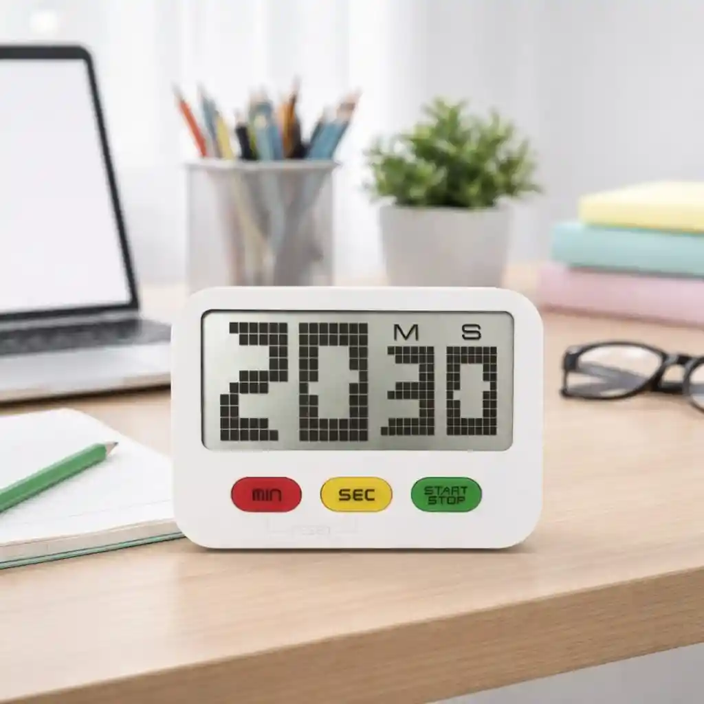 El temporizador digital CR-350 color blanco es una herramienta práctica para controlar el tiempo en diferentes actividades como cocina, estudio, ejercicio o trabajo. Su pantalla grande permite ver el tiempo fácilmente, mientras que sus botones de acceso rápido facilitan su uso. Cuenta con funciones de minutos y segundos, además de un botón de inicio y pausa, lo que lo hace ideal para medir tiempos con precisión. Su diseño compacto permite colocarlo sobre la mesa o en cualquier superficie de forma estable. Perfecto para cocinar, estudiar, entrenar, realizar tareas o controlar tiempos de trabajo. Características * Modelo: CR-350 * Color: Blanco * Pantalla digital grande y fácil de leer * Función de cronómetro y temporizador * Botones independientes para minutos y segundos * Botón Start / Stop para iniciar o pausar * Diseño compacto y práctico Contenido * 1 Temporizador digital CR-350 blanco