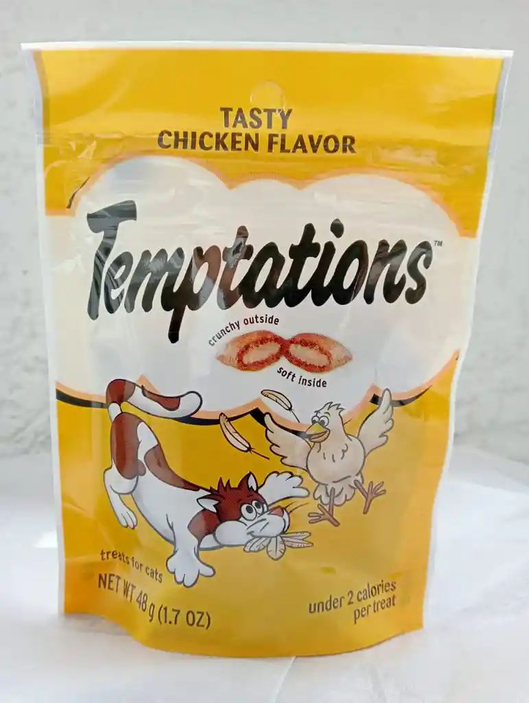 Los gatos no pueden resistir el delicioso sabor de Temptations, así que puede darle a su gato estas perfectas golosinas mezcladas para gatos de Temptations y vendrá corriendo en el momento en que abra el paquete Cada uno de estos snacks para gatos tienen menos de 2 calorías y brindan una combinación irresistible de texturas crujientes y suaves. Tienen el tamaño perfecto para insertar en juguetes para gatos. Intenta mezclar el tiempo de juego colocando algunas dentro de un juguete dispensador de snacks y observa a tu gato como lo persigue. Cada una de estas golosinas para gatos bajas en calorías con sabor a pollo está especialmente formulada para el control y la prevención de bolas de pelo, tiene menos de 2 calorías y proporciona una combinación irresistible de texturas crujientes y suaves.