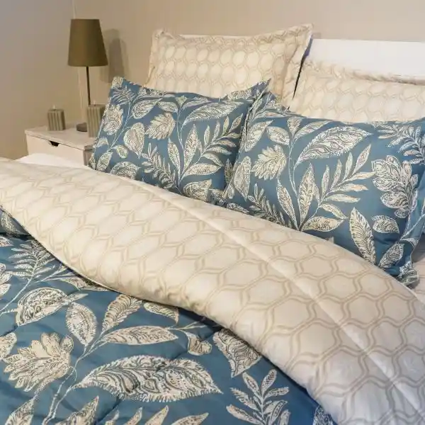 "INCLUYE 1 Edredón acolchado 2 Fundas de descanso (cama sencilla incluye 1 funda) CARACTERÍSTICAS Tipo: Edredón acolchado. Estilo: Con diseño estampado. (El estampado del doblefaz puede variar) Material: 100 % Polisweet. Hilos: 150. Incluye funda cojín: No. Hecho en: Colombia. Incluye fundas almohada: Sí. (El estampado de las fundas puede variar) MEDIDAS SENCILLO: Edredón (180x240cm. aprox), funda decorativa (55x95cm aprox) DOBLE: Edredón (215x240cm. aprox), funda decorativa (55x75cm aprox) QUEEN: Edredón (235x240cm. aprox), fundas decorativas (55x75cm aprox) LAVADO Lavar antes del primer uso. Lavar a máquina en ciclo suave con agua fría o máximo 30 °C. Usar detergente suave. Lavar con colores similares. No usar cloro ni blanqueadores. Si la lavadora es pequeña, se recomienda lavar en lavandería para evitar deformar el relleno. SECADO Secar preferiblemente al aire libre. Si usas secadora, hacerlo en temperatura baja. Asegurarse de que el edredón quede completamente seco para evitar humedad o malos olores. Evitar secar al sol directo por mucho tiempo para conservar el color. RECOMENDACIONES No lavar junto con prendas con cierres, velcro o ganchos. No retorcer para escurrir. Sacudir y acomodar el relleno después del lavado para mantener su forma. Guardar en un lugar limpio, seco y ventilado. NOTA: La foto de este producto es de referencia y ha sido ambientada. No incluye accesorios, ni piezas adicionales ni ningún otro elemento que lo acompañan diferente a lo descrito."