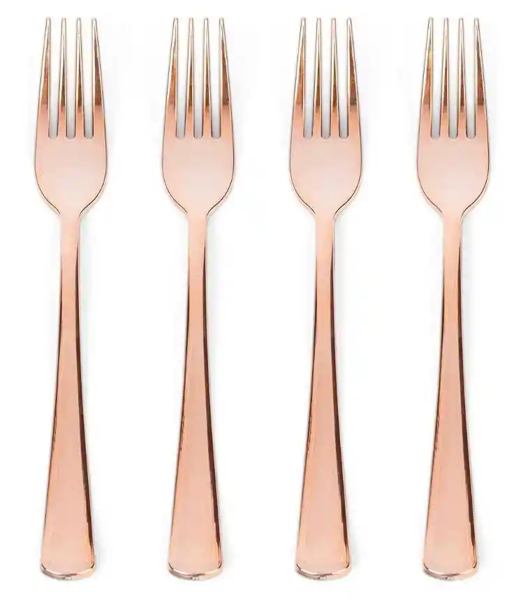 TENEDOR PLÁSTICO DESECHABLE ORO ROSA, TENEDOR MUY RESISTENTE Y ELEGANTE PARA CUALQUIER OCASIÓN, PARA DAR UN TOQUE ÚNICO A SU MESA. VÉRSATIL PARA EVENTOS Y CATERING. CADA PAQUETE CONTIENE 10 UNDS DE 17.8 CMS